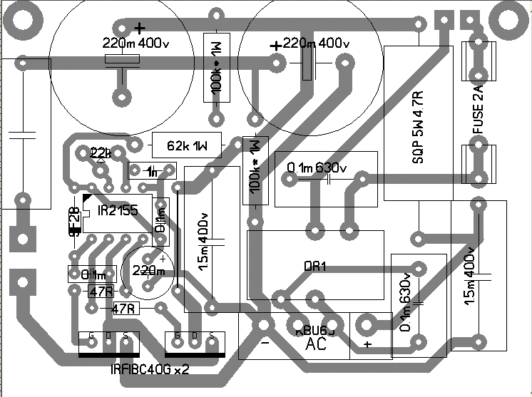 Конденсаторы 220 мкФ 400 В перенести вниз платы, транзисторы IRFBC поменять местами, микросхему драйвера повернуть вверх ключом и не стесняться использовать перемычки. Тогда самые критичные проводники станут значительно короче.