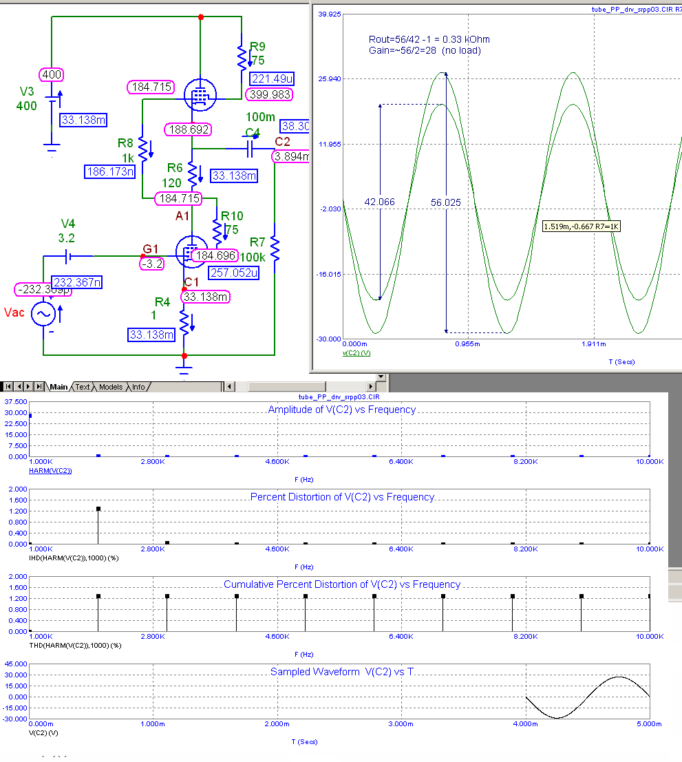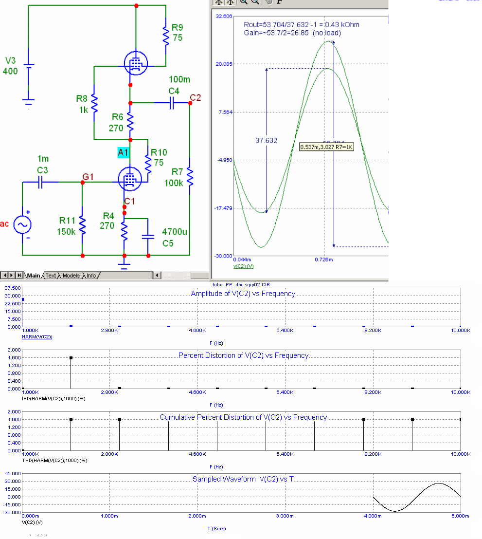 Вот , наконец-то нарисовал схему своего гибридного усилителя . Вообще , я уж не раз замечал , что мне проще сделать схему , чем её нарисовать и выложить куда-нибудьИдея этой схемы возникла 10 лет назад - сначала я обнаружил прекрасные звуковые свойства лампы 6Э5П , а потом стал пробовать её с разными выходными каскадами . Я пробовал много чего , вплоть до ГМ-70 , и тогда же решил испытать свою давнюю идейку - сделать параллельный повторитель со смещением напряжением , чтобы устранить органически присущие классическому варианту недостатки , а именно ограничение по выходному току и довольно большие потери по напряжению выхода . Результат превзошёл все ожидания . Мнение о том , что такое смещение неминуемо приведёт к тепловой нестабильности каскада - оказалось совершенно неверным . Если обеспечить тепловую связь между мощными транзисторами и диодами в источнике смещения , то проблем нет никаких , а есть только преимущества . Ток выхода в таком каскаде теперь равен входному току каскада , умноженному на произведение усиления предвыходного и выходного транзисторов , и в данном случае может достигать 15 ампер , а выходной каскад , что интересно , может работать в режиме rail-to-rail , то есть практически до напряжения питания . Кроме того , из-за жёсткой связи переходов БЭ всех транзисторов значительно улучшается симметрия каскада на высоких частотах , так как устранена несимметрия токов заряда и разряда ёмкостей переходов при резких перепадах в сигнале . А это , кроме того , позволяет устранить "ступеньку" в классе АВ , и позволяет работать без ООС с малыми искажениями . Что положительно сказывается на звуке , понятное дело
