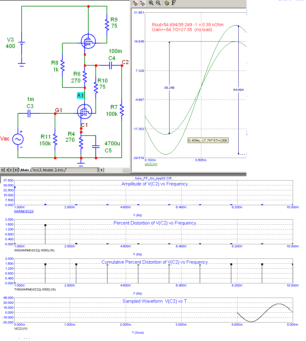 Насчёт особенностей схемы . Во-первых , тут применено любопытное решение каскада SRPP на тетродах . Как видно из схемы , экранная сетка нижнего тетрода включена не на его анод , как это обычно делают , получая из тетрода триод , а на выход каскада . Это позволяет охватить каскад местной ООС , притом на экранную сетку . В результате - искажения каскада SRPP приближаются к таковым у триодного каскада , что улучшает его звук . Также снижается выходное сопротивление каскада . Далее , в выходном каскаде применено не обычное двуполярное включение питания , а "виртуальная средняя точка" на конденсаторах . Это решает сразу несколько проблем . Во-первых , исключает появление постоянного тока в цепи нагрузки , во-вторых , устраняет перезаряд ёмкостей питания от диодного моста при их несимметричном разряде сигналом . Это позволяет устранить очень неприятные импульсные искажения , возникающие при работе на большой мощности и на низких частотах ( ниже 50 герц ) . Кроме того , такое решение помогает устранить помехи из-за несимметрии половинок вторичной обмотки транса питания и диодов моста . А так как земля входного сигнала подключена на среднюю точку , то и сами кондёры питания оказываются как бы "исключены" из звуковой цепи , что уменьшает их влияние на качество звука .