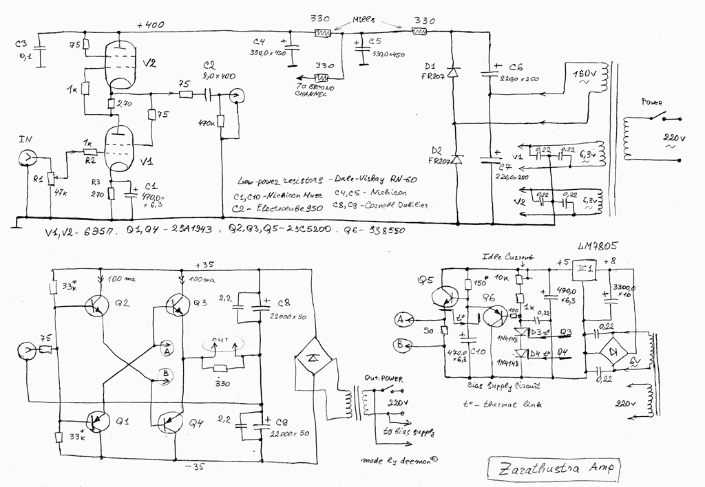 Дальше я развивал эту идею , и сделал несколько разных версий такого усилителя , отличавшихся разными вариантами входного каскада SRPP на лампах 6Э5П и выходного каскада , в том числе был и вариант выхода в чистом классе А с током покоя до 4 ампер . Несмотря на различия , у всех этих усилителей характер звука похож , что и неудивительно - концепция-то одна . Пэтому я и назвал весь этот проект одним именем - Zarathustra . Почему именно так ? Наверно , потому что характер звука этого усилителя навёл меня на эту мысль .... но это , впрочем , уже "лирика"