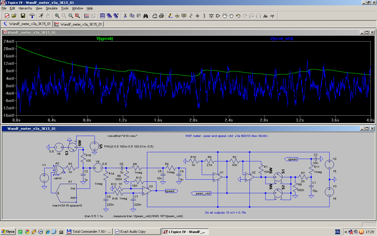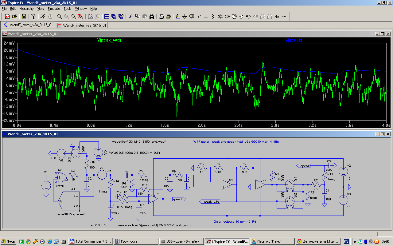 Сделал вторую версию - с выходом квазипикового значения детонации и с выходом отклонения скорости. Кроме этого, шкала на всех выходах теперь одинаковая: 10 мВ = 0,1% . Выкладываю схему, файл LTspice и картинку с результатом. Как можно заметить, отклонение скорости составляет примерно +0,6 - +0,7%, пиковая взвешенная детонация +0,23% -0,42%, квазипиковая (вполне совпадающая с тем, что показывает мой "железный" детонометр) - 0,18% с одним выбросом до 0,24% .
