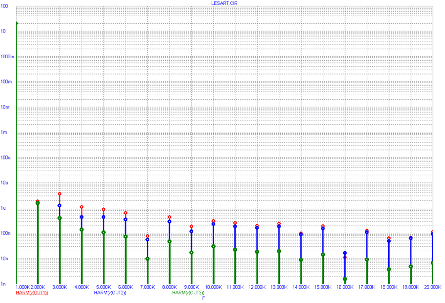 Спектр гармоник схемы поста#58 (красный). Синий - добавлен ЭП для зеркала Q6, Q9 (И. ЗАМОТКИН). Зеленый - введена доп. коррекция с выхода УМ в точку соединения коллекторов Q5, Q6.