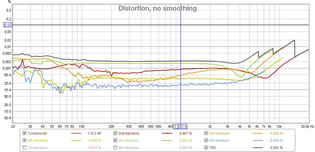 Искажения от 2й до 6й гармоники во всём частотном диапазоне.