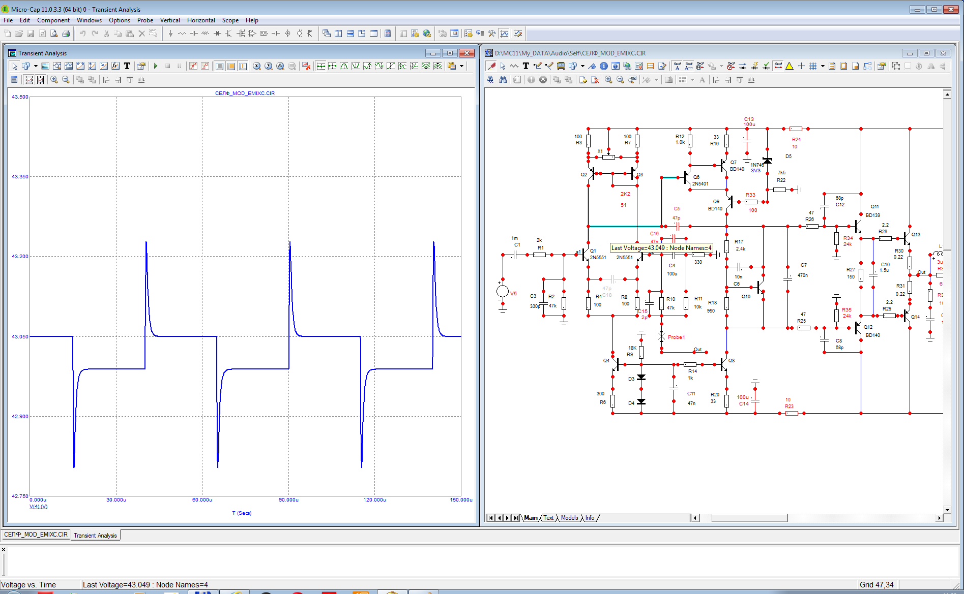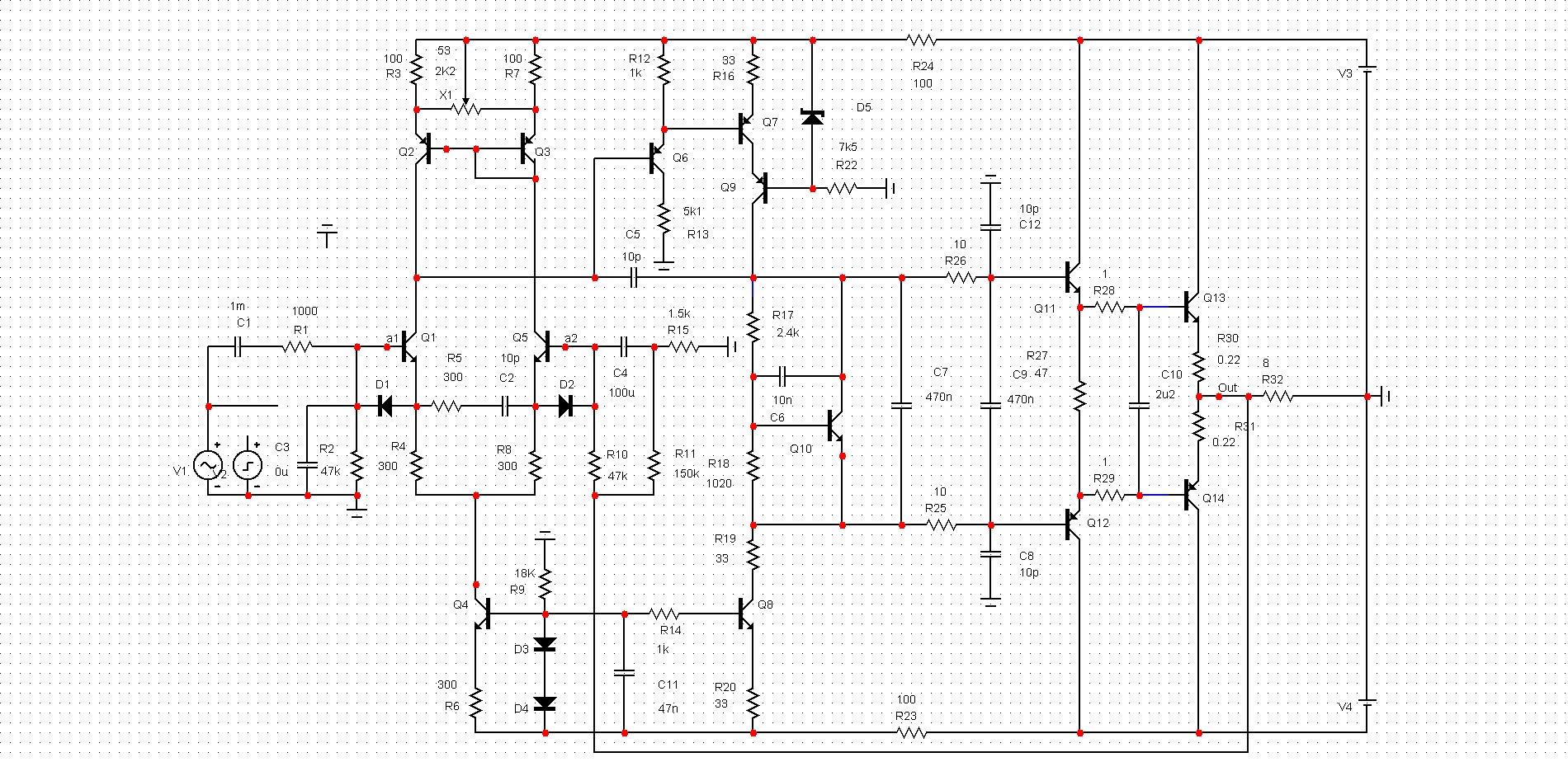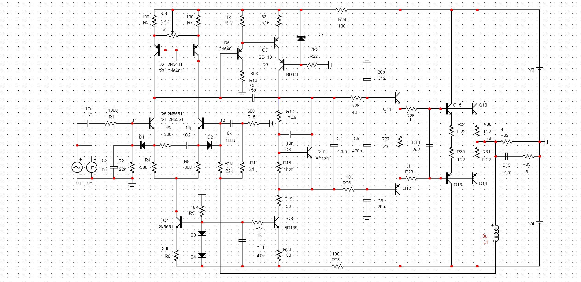 Я привел подправленную модель по исходной схеме автора темы. В модели поправлены параметры транзисторов, по сравнению со штатными, которые не совсем корректны для анализа стабильности ( BD139, BD140) - емкости переходов у исходных моделей отсутствуют, граничные частоты завышены в 3-4 раза. В модели схемы усилителя добавлены - резистор в базе транзистора каскода - против возбуждения на граничной частоте, чем грешит схема ОБ при неудачном монтаже. Добавлены резисторы подтяжки предвыходного каскада - ускорение разряда диффузионных емкостей транзисторов и уменьшение TIM искажений за счет уменьшения задержки в цепи ООС ( токам перезаряда надо куда-то вытекать и причем, довольно быстро). Введены более тяжелые ФНЧ в предвыходной каскад для коррекции полюса ВК, устранения подъема АЧХ на частотах 8-10 МГц с возможным подвозбуждением. Коллектор транзистора второго каскада (ЭП) включен к эмиттеру выхода каскода (ОБ). Это фиксирует потенциал коллектора ЭП и стабилизирует емкость перехода КБ. Также такая схема лучше работает в клиппе УН. Увеличен резистор смещения ВК с 47 до 150 Ом. При данных выходных транзисторах нет смысла сильно разгонять токи предвыхода и снижать входное сопротивление двойки ВК-что приведет к повышенной нелинейности УНа. Остальное - традиционно и комментариев не требует.