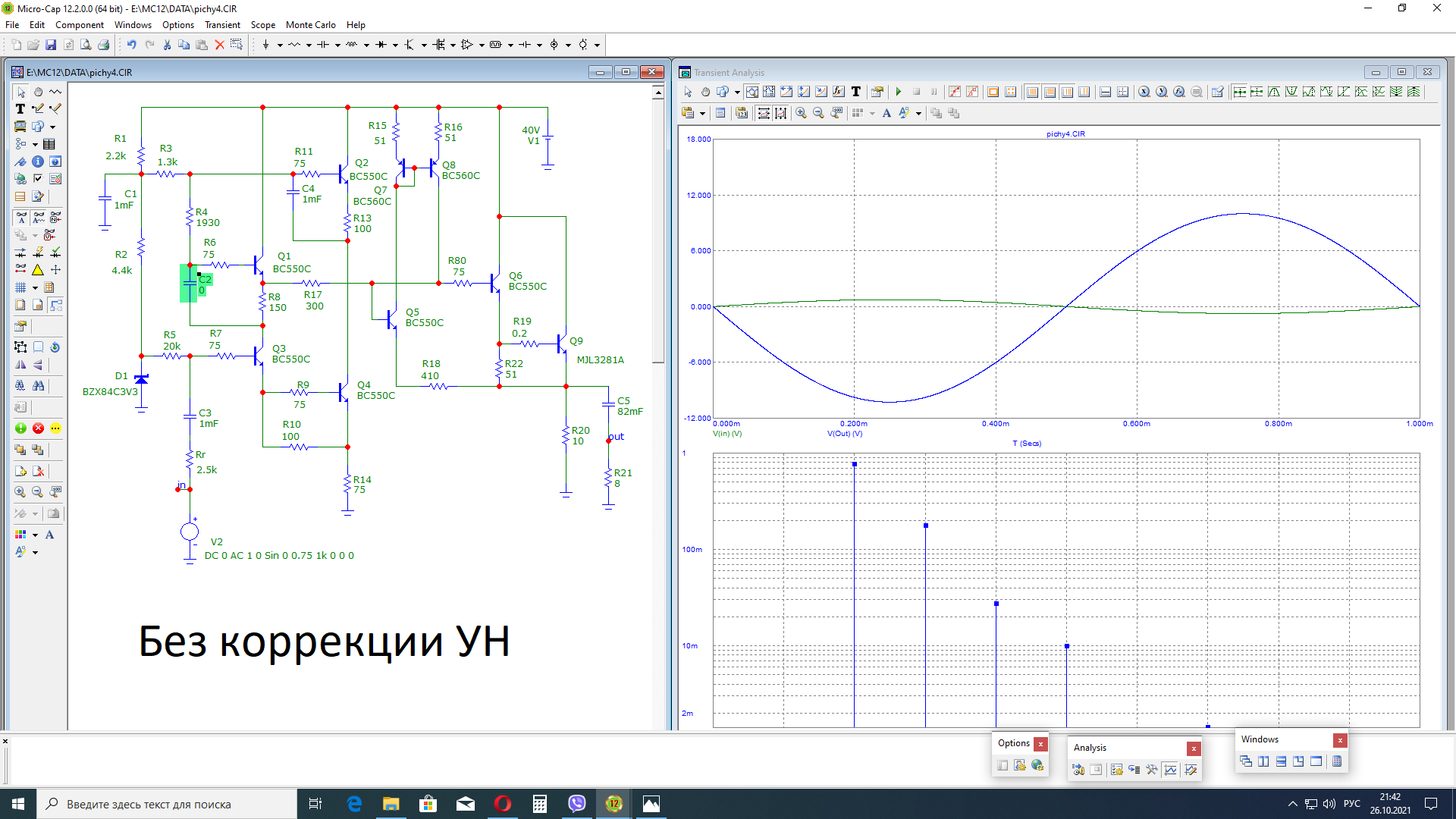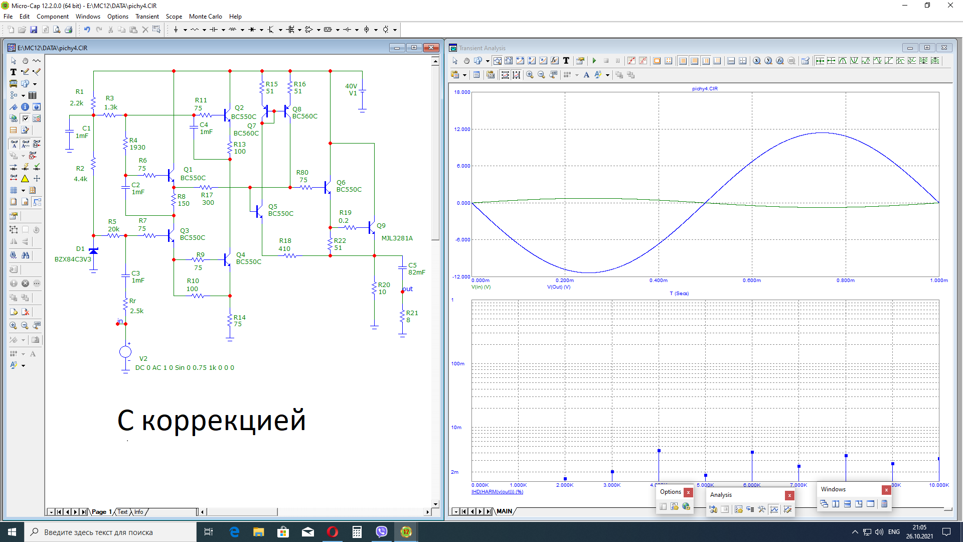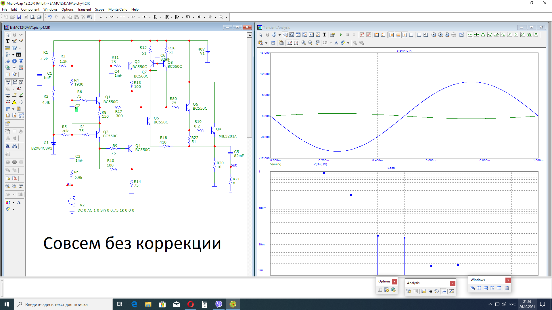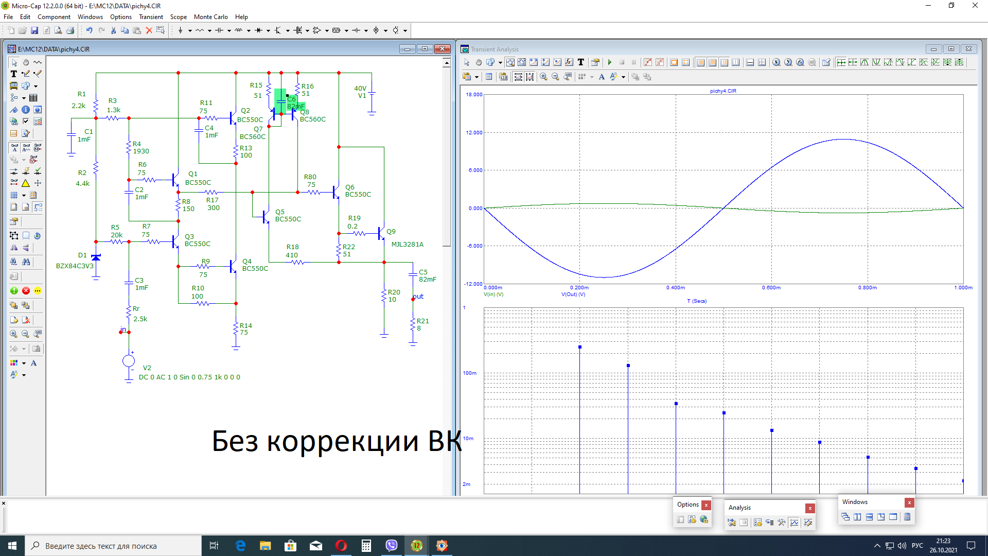 На рис. с) приведена полная принципиальная схема усилителя «Валамон» и спектр искажений, который обещает Микрокап. Выходная мощность как и у предшественника примерно 8 Вт. А вот выходное сопротивление сотые доли Ома.