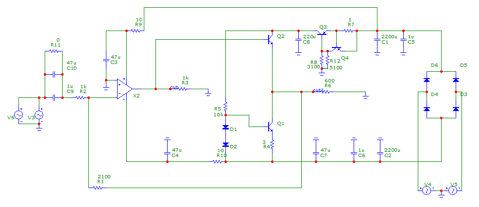 Но в ходе эксприрементов, поскольку питалось это все от лабораторного Тека, его защита по току вполне справлялась с защитой верхнего транзистора. Энергии стоящего по питанию электролита было недостаточно, чтобы спалить транзистор при КЗ на выходе, (чего я опасался), поэтому в первой схеме защита по току перенесена с выходного транзистора в питание.
