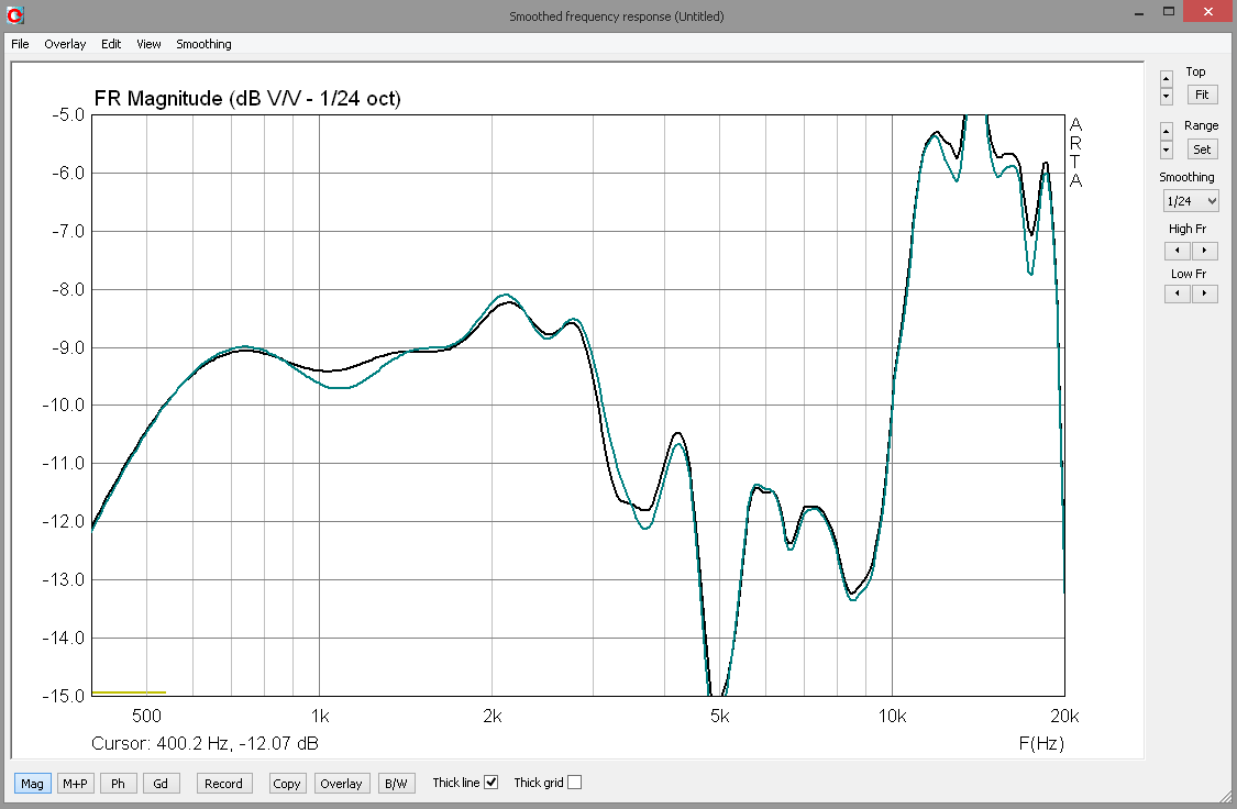 Это АЧХ пары СЧ (включены последовательно) с бортиком и без оного - черный - бортик 22мм есть, бирюзовый - бортика нет