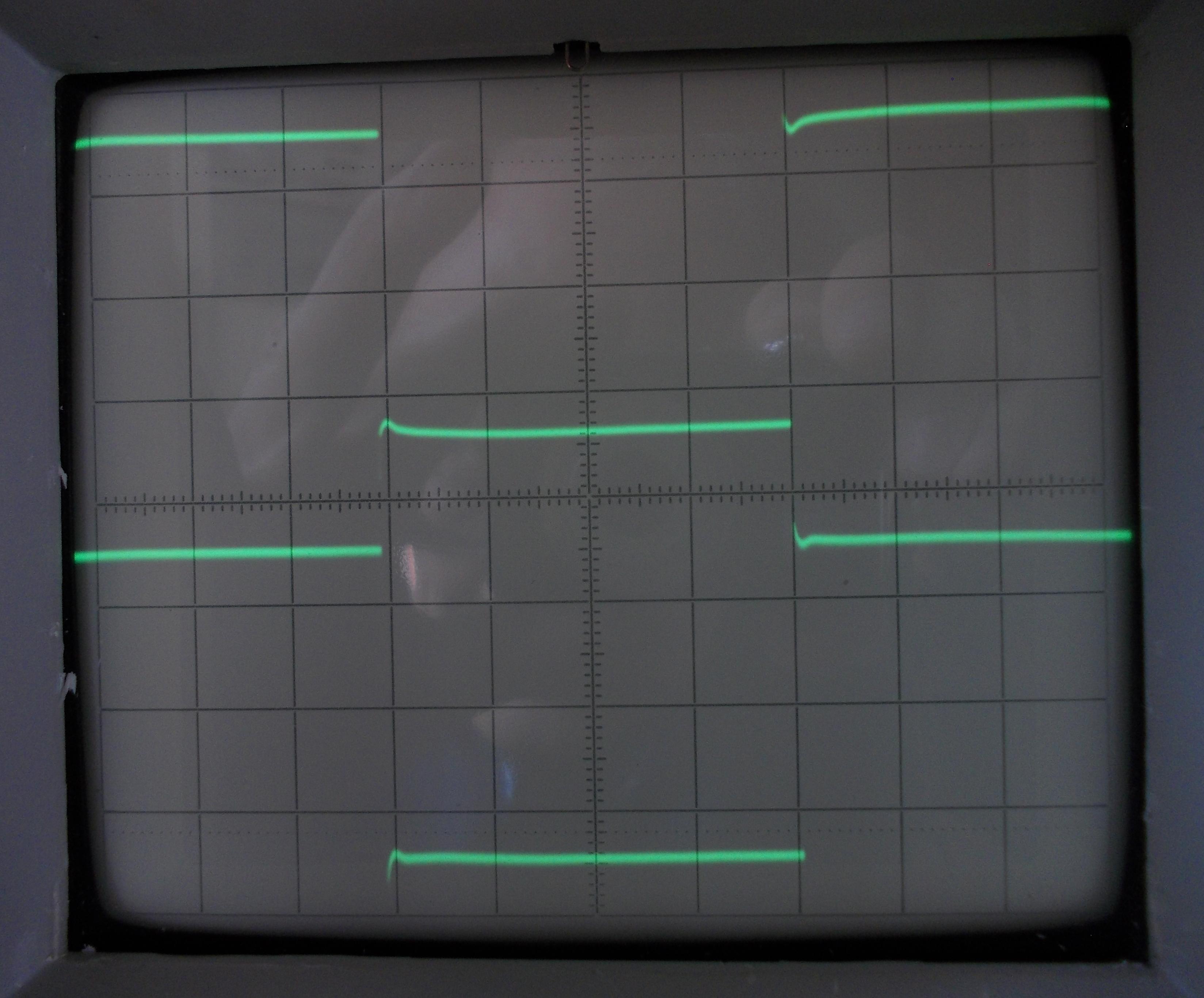 Вехняя осциллограмма - на клеммах нагрузки , нижняя - на выходе усилителя . Мощность около 10 W .