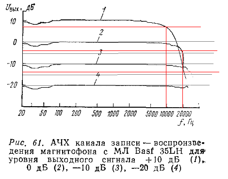 Я давно пробовал на отечественной ленте,не помню уже какого завода,по уровню -20дБ получается 22.5к легко.По уровню -10дБ,поменьше,но не сильно.Точную цифру не помню-но вроде бы 17 или 18кГц.Потом я заменил провода от головки до УВ(для исключения разьема от ГВ до УВ из цепи сигнала-1дБ шума),но неудачно,не посмотрел,что у новых проводов емкость выше,чем у родных,и воспроизводимая полоса сузилась на ~ 1кГц или где-то так.