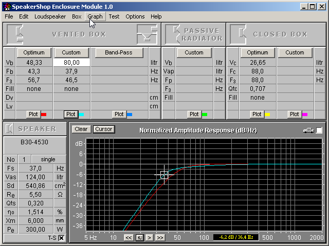 В- http://www.phlaudio.com/datasheets/30_pdf/4530.pdf даже в 80литрах(больше 80л неудержать полку) на 37гц -6дб завал,и в 60 литрах -9дб завал.