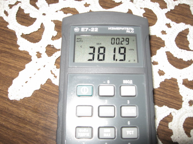 Показывает значение емкости: на частоте 120 Гц 381,9 мкф, esr 00,29;
