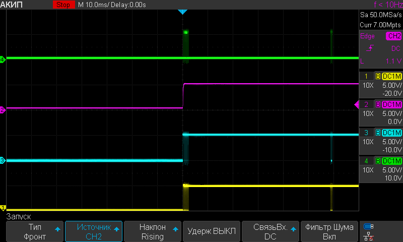 Работа с четырьмя каналами для отслеживания цифровых процессов (АКИП 4131/1А). К однократной синхронизации есть претензии, срабатывает далеко не всегда, и неясно, почему, видимо, не любит медленные процессы. Но иногда срабатывает, как нужно.