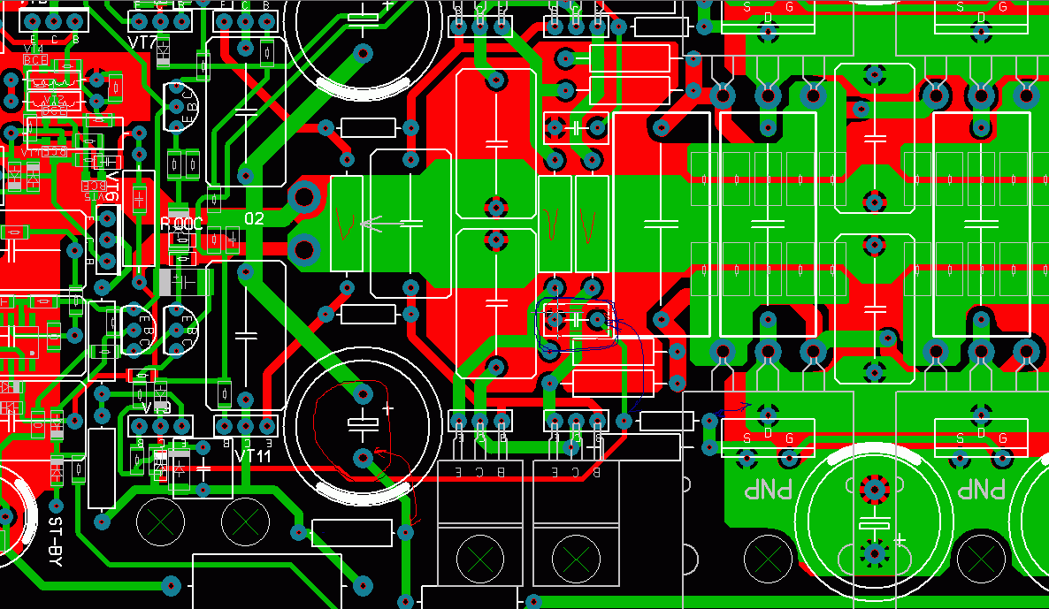 Так понимаю по питанию ВК стоят защитные полевики, внизу ПП по минусовому плечу надо перекинуть питание предвыхода на другой полигон, т.е. после полевиков, ну и полярность электролитов ВК поменять. Выводные резисторы, пометил V, оставить как есть, остальные 0.5 - 1 Вт и 2 Вт заменить на чипы 2512, обведённую плёнку и электролит не оставлять в стороне. В эмиттерах ВК по 5 шт. 2512 - не много ли однако ?
