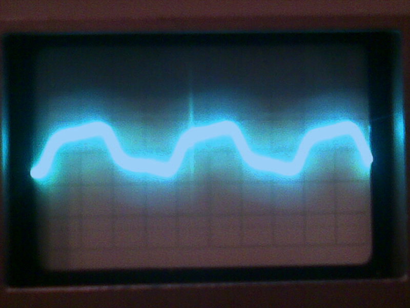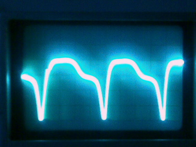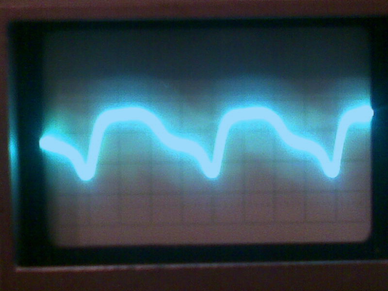 Развёртка 10мВ/дел, мерил через делитель 1:10 на резисторе 10 Ом, включенном в нулевой провод.