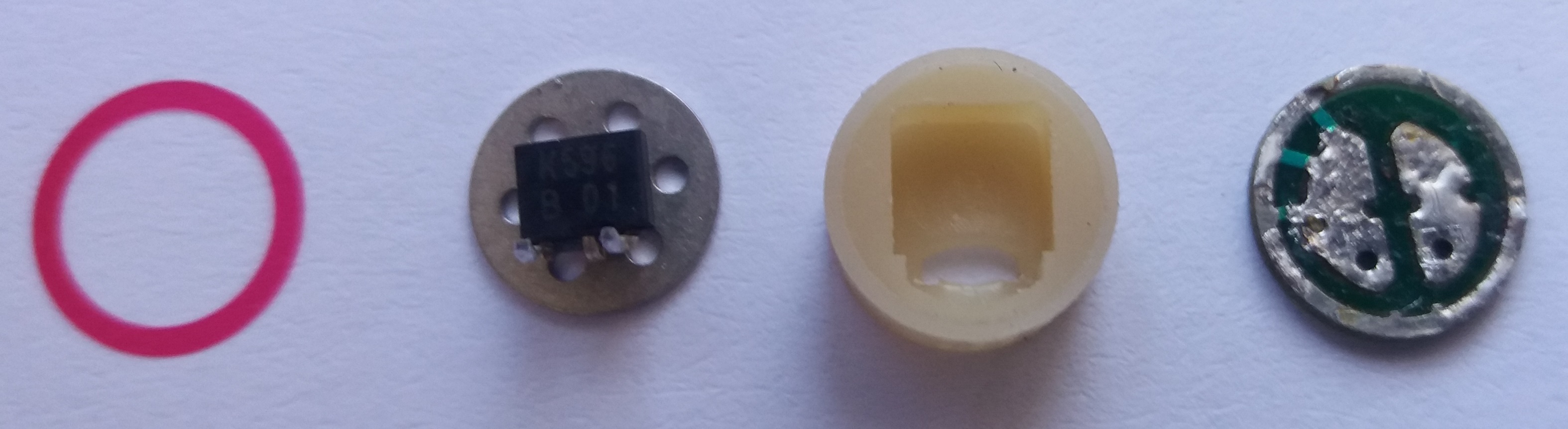 2). Продолжаем курочить. Слева-направо кольцевая прокладка, неподвижный электрод с усилителем, пластиковая обечайка (просто конструктивный элемент, для автоматизации сборки), контактная группа (стеклотекстолит фольгированный обыкновенный).