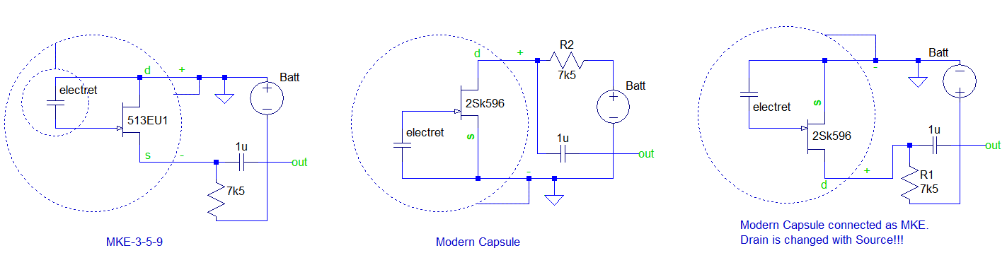 А включение капсюля в МКЭ3-5-9 действительно странноватое по нынешним временам - корпус капсюля (и подвижный электрод микрофона) соединен со стоком ПТ. По сути неважно, с каким выводом ПТ, стоком или истоком, соединять корпус капсюля. Лишь бы точка соединения была эквипотенциальной.