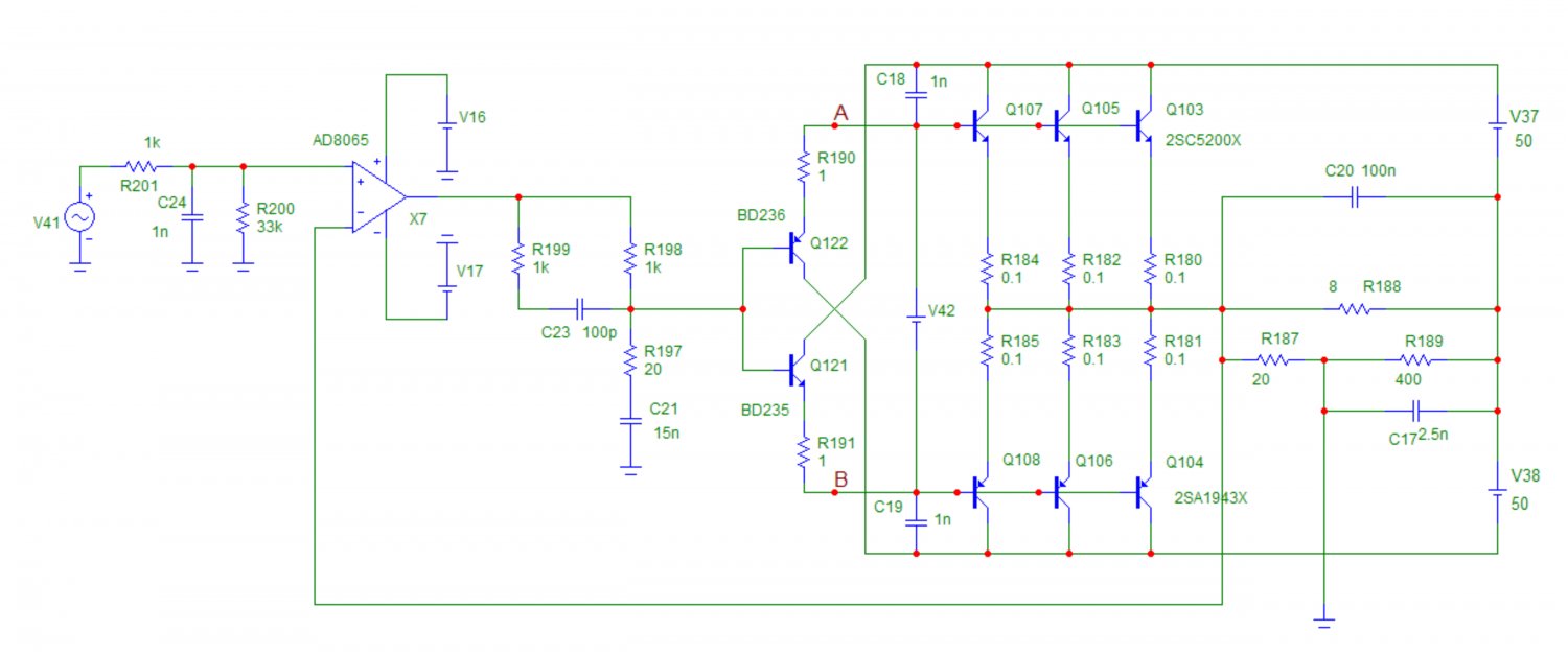 А здорово получилось , однако . Эта идея с подвешенной нагрузкой - супер ! Тут ведь и прямое прохождение сигнала через ёмкости ВК на ВЧ не страшно , так как ООС снимается с неинвертирующей точки , и значит - никакого разворота фазы тут не будет , и проблем никаких Только я бы уменьшил R187,189 , чтобы сделать цепь ООС более низкоомной - на неё меньше будут наводиться разные помехи , да и базовый ток тоже не будет заметно влиять . Да и потом , BD235-236 всё же слабоваты , чтобы стоять так в предвыходе на полном питании - там надо что-то помощнее .