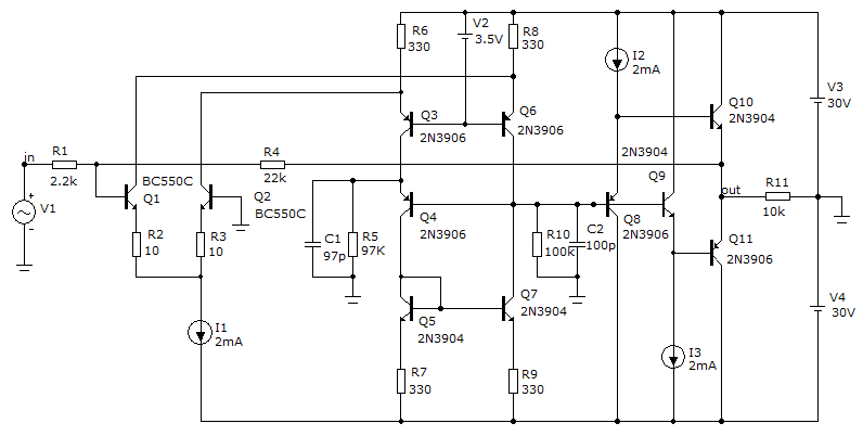 Подбором импедансов в точках 111 и 222 (так же нужно учитывать и импедансы Q5 и зеркал) можно заметно улучшить линейность.