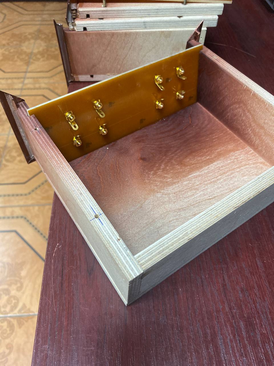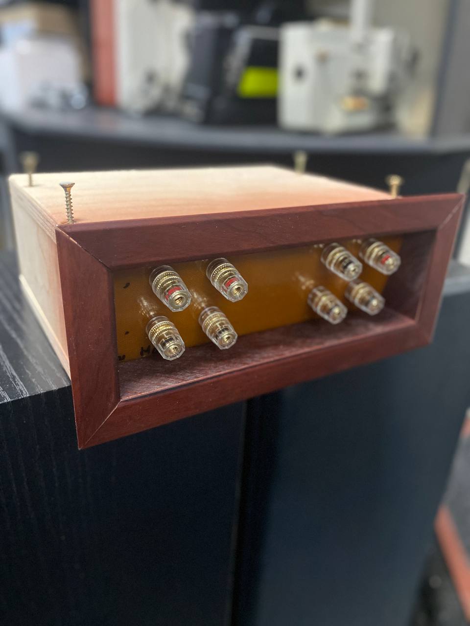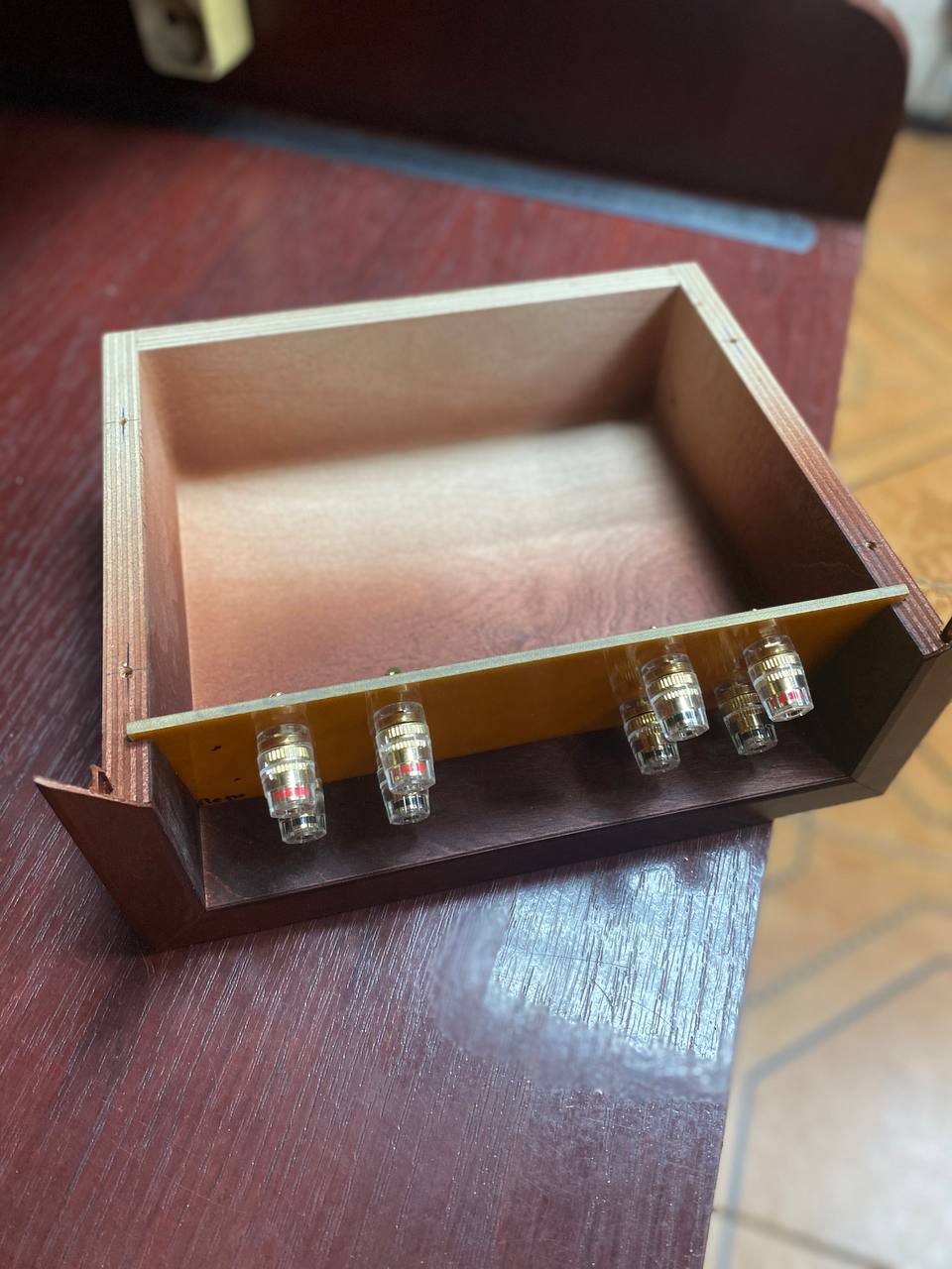 Закрепил клемы в съемный бокс, две левые пары - 2 НЧ динамика и с правой стороны СЧ и ВЧ. Осталось покрасить текстолит в чёрный цвет и можно припаивать динамики.