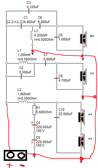 Подскажите плз. еще вопрос - правильно я понимаю, что НЧ динамики подключены последовательно, т.е. "+" одной к "-" другой ?