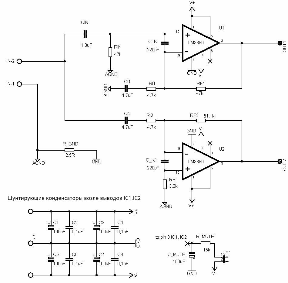 Можно одну цепь, только сопротивление в цепи MUTE ставить в два раза меньше, чем для одной LM-ки.