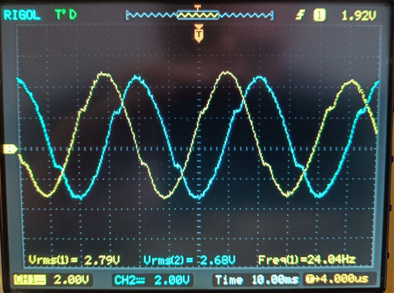 При размахе как на осциллограме выше, напряжение на датчиках порядка 4,6 - 4,8В (оно модулировано). При торможении до полного останова - возрастает практически до 9В.