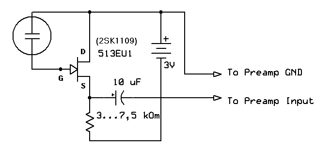 Никакой схемы, точно как К513 в МКЭ-5 - на Исток Минус 3В, на Затвор сигнал от капсюля, и Сток на Общий с корпусом от капсуля.....