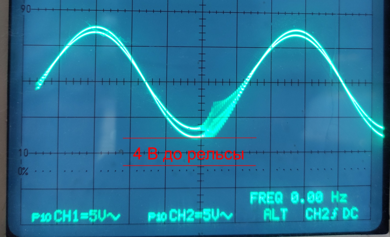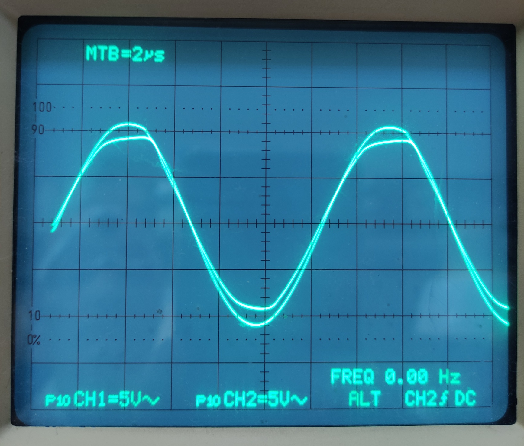 Вот пример осциллограмм при малом напряжении питания (+-12 В) в режиме большого сигнала (амплитудой 5 В), без нагрузки и с нагрузкой 2 Ом. Разницы практически нет.