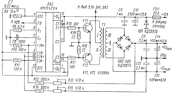 И еще там на схеме не показано, но на фотке его преобразователя видно что разработчик поставил электролит небольшой между "-12 В" и "8, 11 и 12 нога микросхемы" почему так?