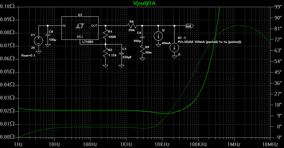 Проблема трехногих стабов, в том, что более или менее линейный импеданс и фаза получается при определенном выборе номиналов обвязки, тока нагрузки и разности напряжений вход-выход.