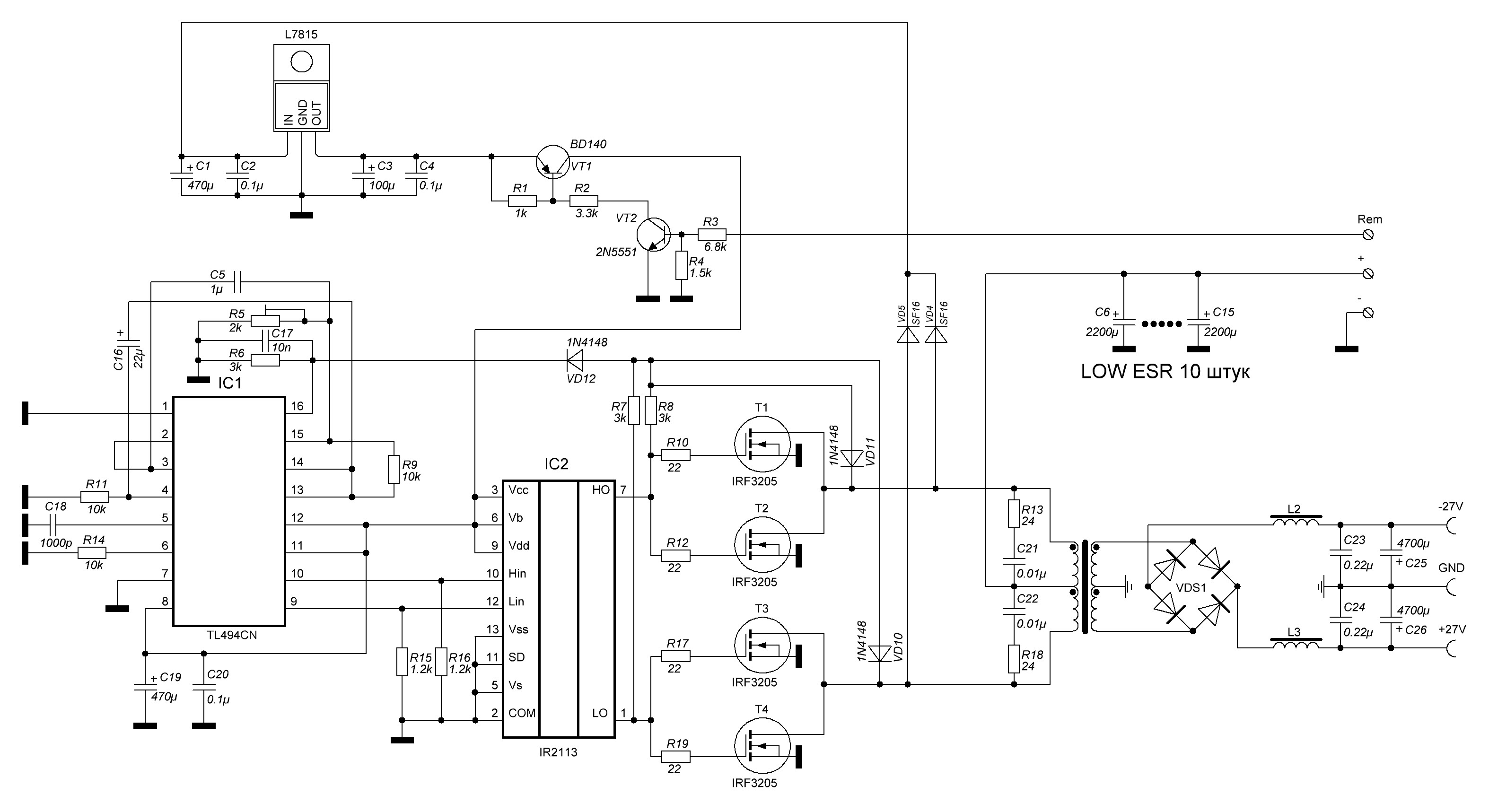 Итак мощность которую я хотел получить от преобразователя, а в последствии и получил - 500 W. Напряжение на выходе равно +-27 V. Оно обусловлено напряжением питания TDA8924TH.