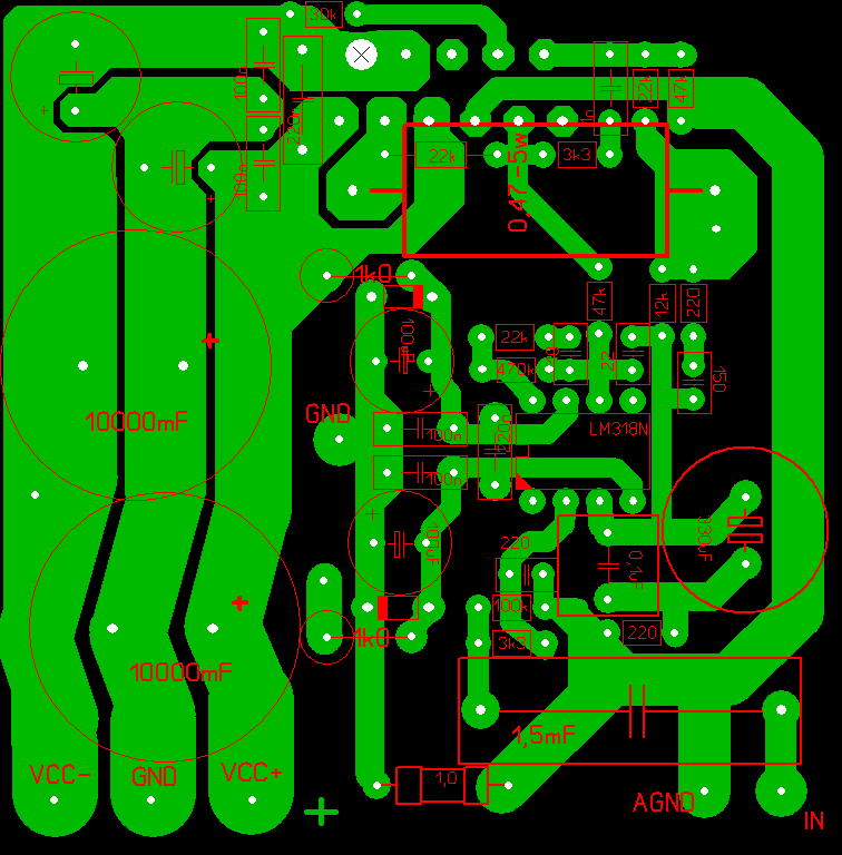 зы: вообще разводка платы довольно простая и судя по практически отсутсвию шумов удачная, плата односторонняя, вся верхняя сторона работает экраном и заземлена в одной общей точке.
