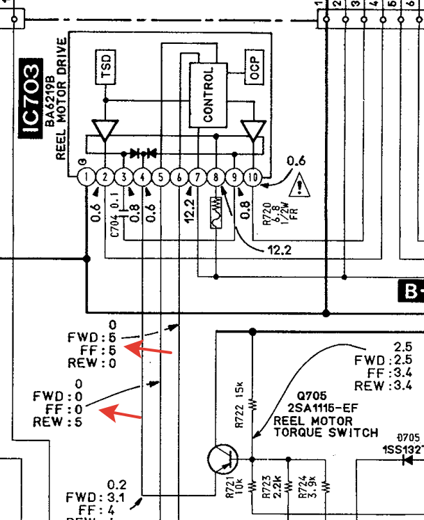 Пришлось доставать осциллограф. Обнаружилось, что проц постоянно выдаёт на 6 пин драйвера BA6209 управляющий сигнал, если нажать кнопку Open, то сигнал подаётся на 5 пин драйвера не снимаясь с 6-го. Диаграмм в мануале нет, но судя по подписанным напряжениям такой вариант невозможен, чтобы сразу прямой и реверсный сигнал шли на драйвер, см. скрин, понятно у него есть защита от такой ситуации, но зачем так делать, напряжение на двигателе ведь будет 0в.