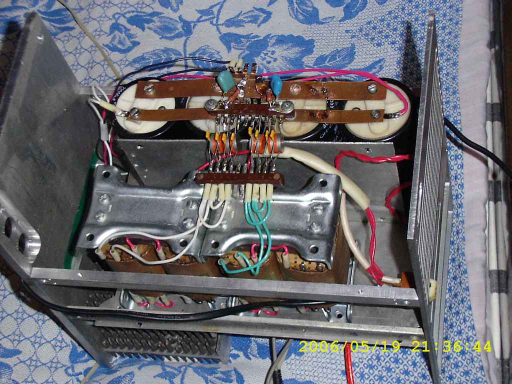Как соединены банки, думаю, видно. Верхняя планка является землей, посредине площадка общей точки с кучей отводов. К ней также заземлен корпус (на фото пока этого нет). Каждая пара банок зашунтирована 0.1мкф в параллель с 1ком, плюс между плечами 0.1мкф металлобумажка (не видна, под колодкой выпрямителя). Каждый диод зашунтирован керамикой на 0.1). Думаю менять этот порнографический выпрямитель на версию на плате. в связи с этим вопросы как лучше сделать: