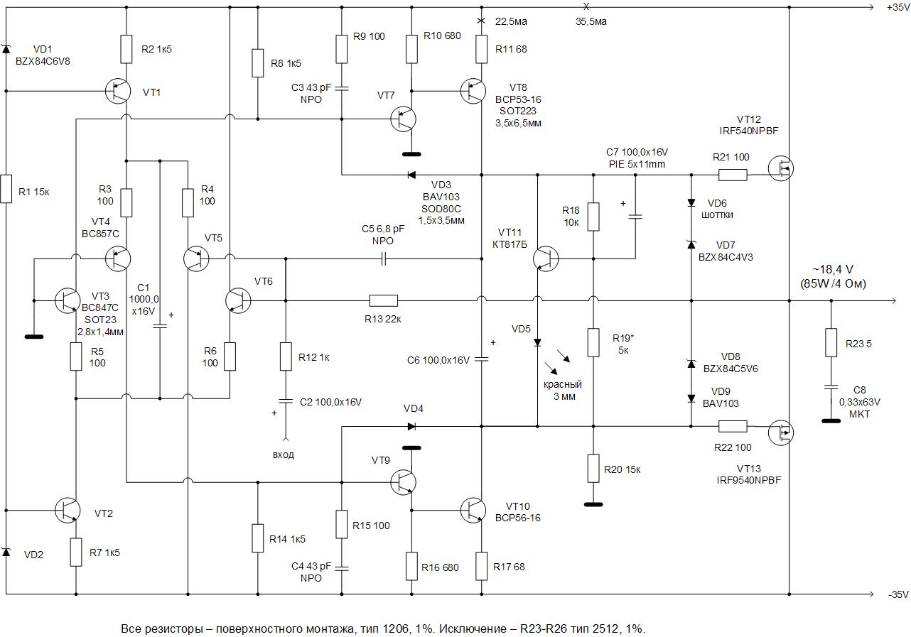 1)АБ с чуток увеличенным током покоя(регулируемый) мощностью в 50Вт на 8Ом, 100 на 4-ре и 150-180 на 2Ома(тут наступит скорее всего предел БП). Схему думаю стоит делать на паре 1943/5200.