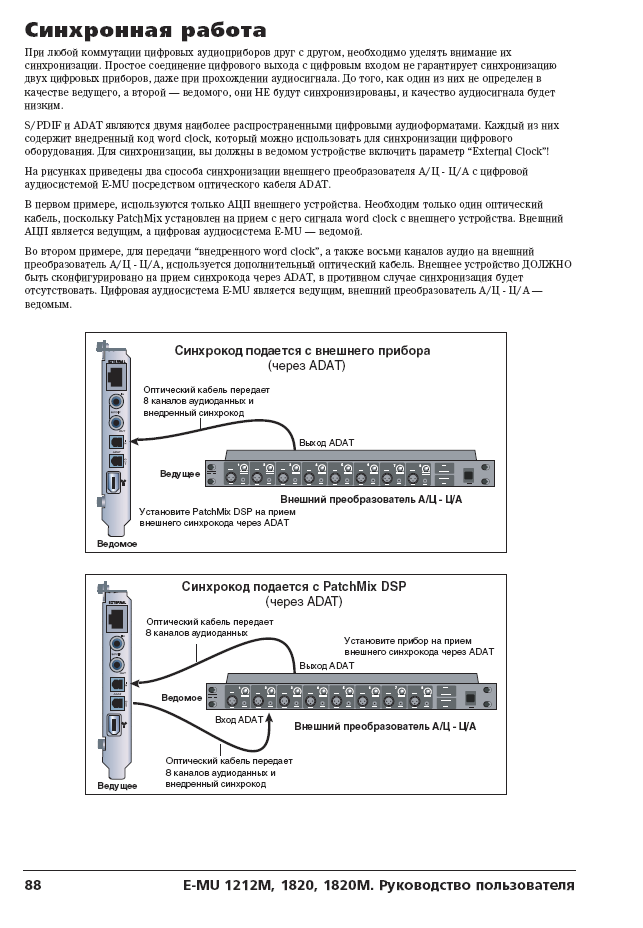 Короче, если ближе к нашему практическому применению. Подключаем внешний девайс(допустим АЦП) по цифре на вход карточки, на карте ставим внешний клок. Карта синхронизируется от него. Если поставить внутренний клок, то надо брать синхру на этот АЦП с цифрового выхода карточки и вытаскивать его из СПДИФа. Если подключаем ещё один внешний девайс (скажем ЦАП) на СПДИФ выход карточки, необходимо ставить на карточке внешний клок. И этот ЦАП будет синхронизироватся от клока внешнего АЦП. Кстати, если они в одном корпусе, I2C на входе ЦАП будет наверно полезно зареклочить от генератора АЦП.