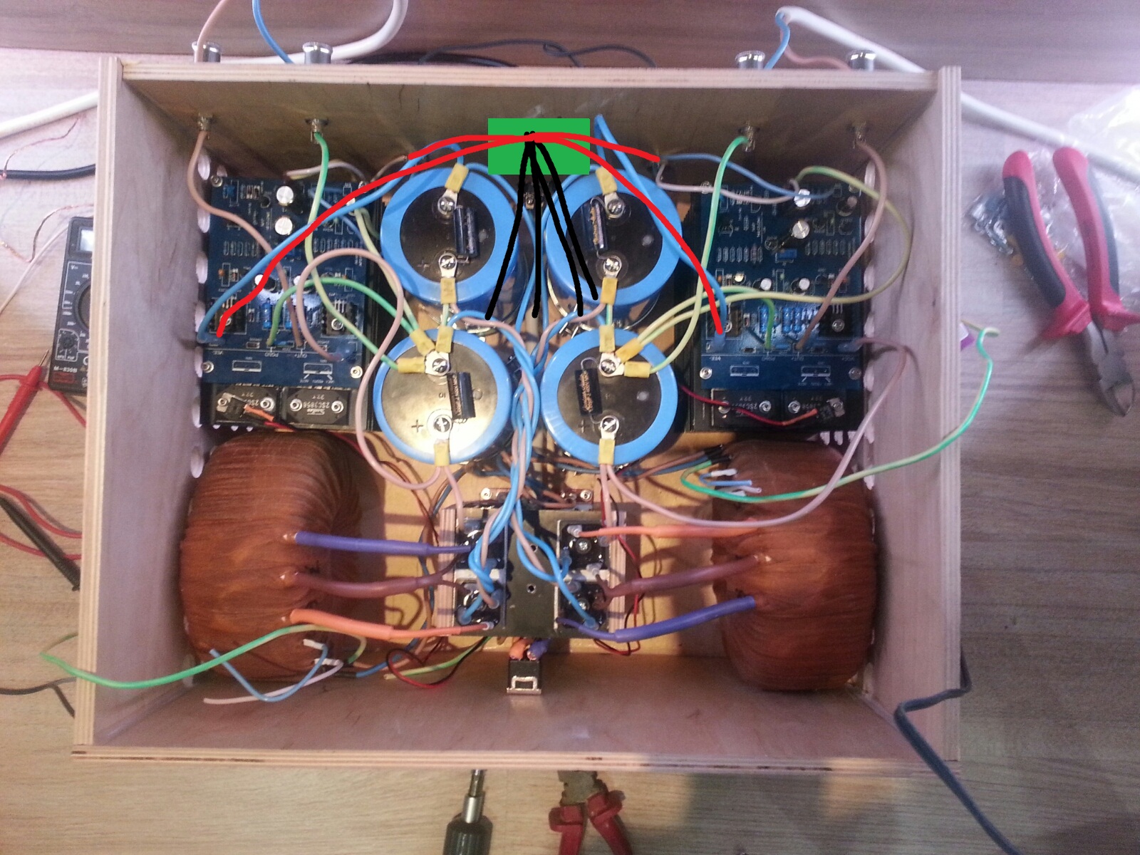 Возможно, местные профи меня заругают, но я бы сделал так: установил бы отдельную шину, к которой подвел все провода, идущие от блока питания на землю, а уже от этой шины идут провода на сами платы и входные разъемы. Вот примерно так Нажмите на изображение для увеличения.