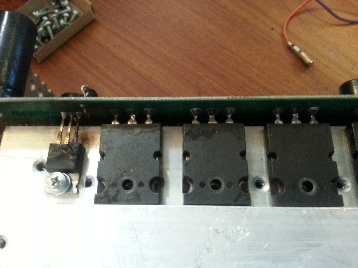 При накручивании тока покоя в момент открытия полевиков, они вошли в ключевой режим. вообщем было много огня искр и дыма. (керамика плавилась)