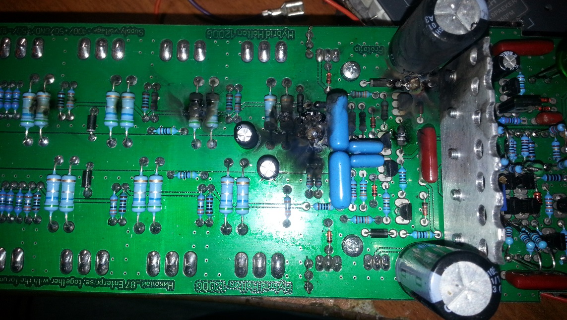 Выгорело полностью минусовое плече, без второго этажа конечно же. по плюсу только один силовой транзистор с эмиттерным резистором