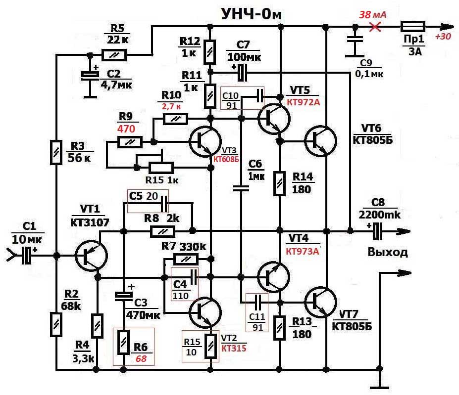 Убрал С10-С11, увеличил С5 до 32 пФ - звучание стало естественнее. Выходные тр-ры при большой (не максимальной, а терпимой) громкости стали греться до 50 градусов. Вчера совсем не грелись. Видимо оттого, что напряжение Б-Э выходных вчера было 0,3-0,4 в, а сегодня - 0,6-0,7 в.