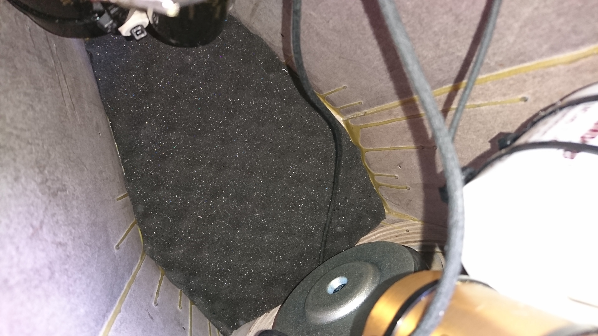 имеет смысл понять где заполнять в зависимости от конфигурации сторон, например, вышло хорошо полностью за динамиком на всех стенках и на дно кусок, остальное - без