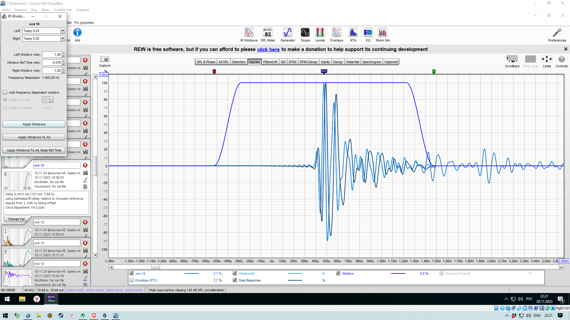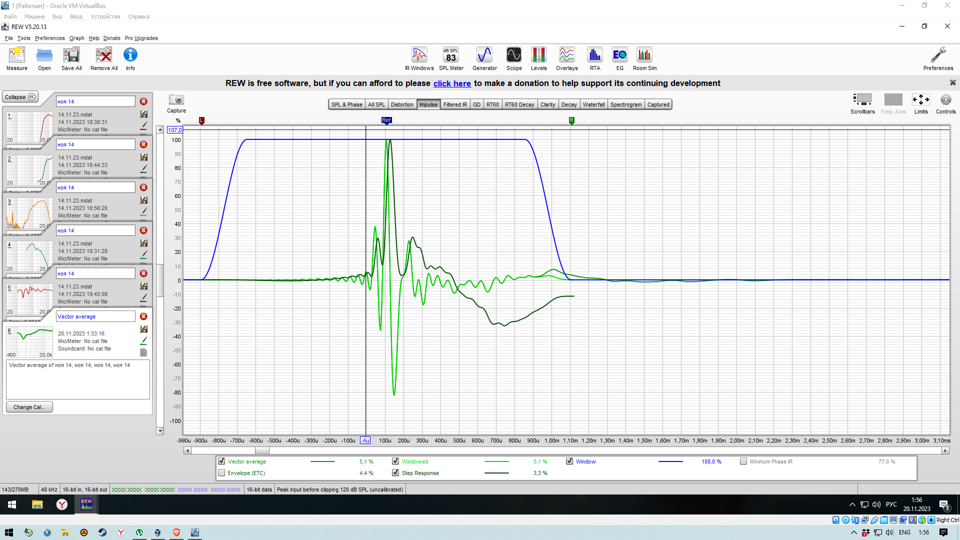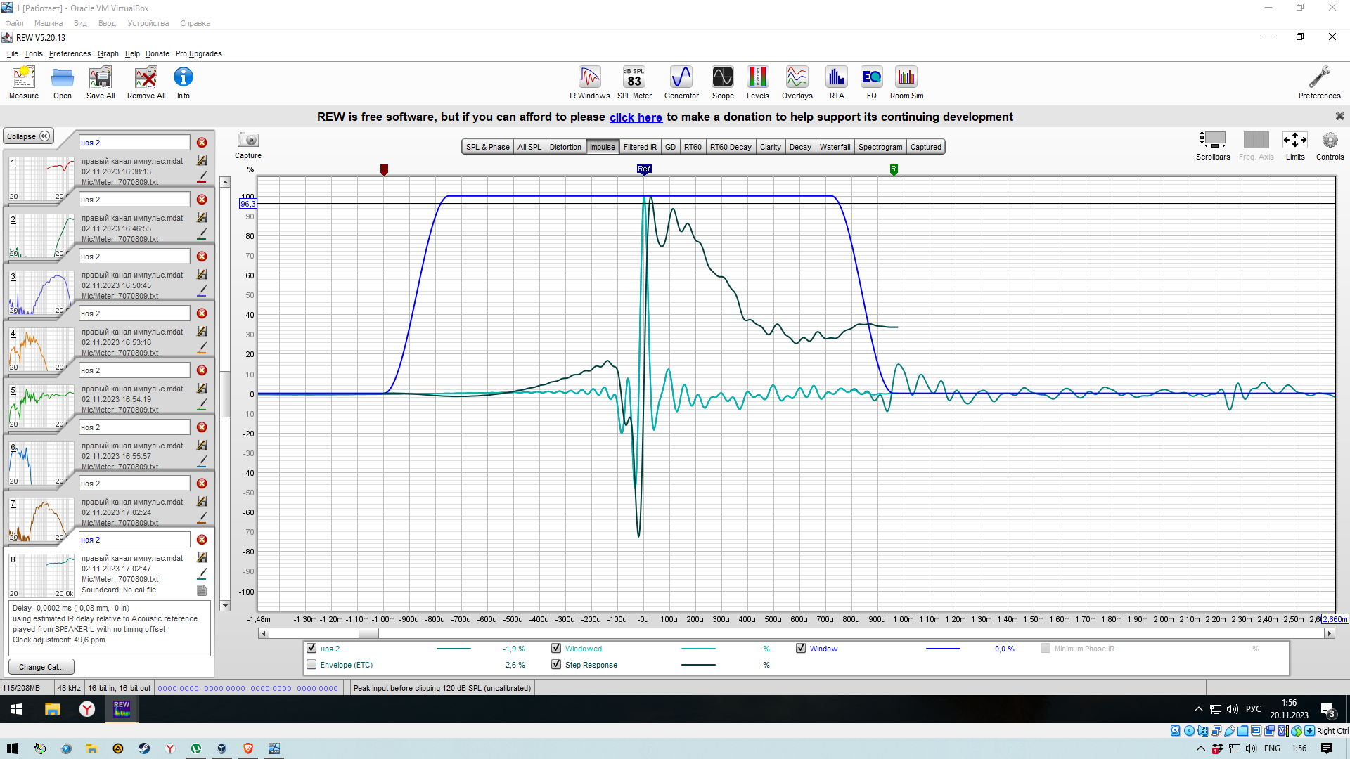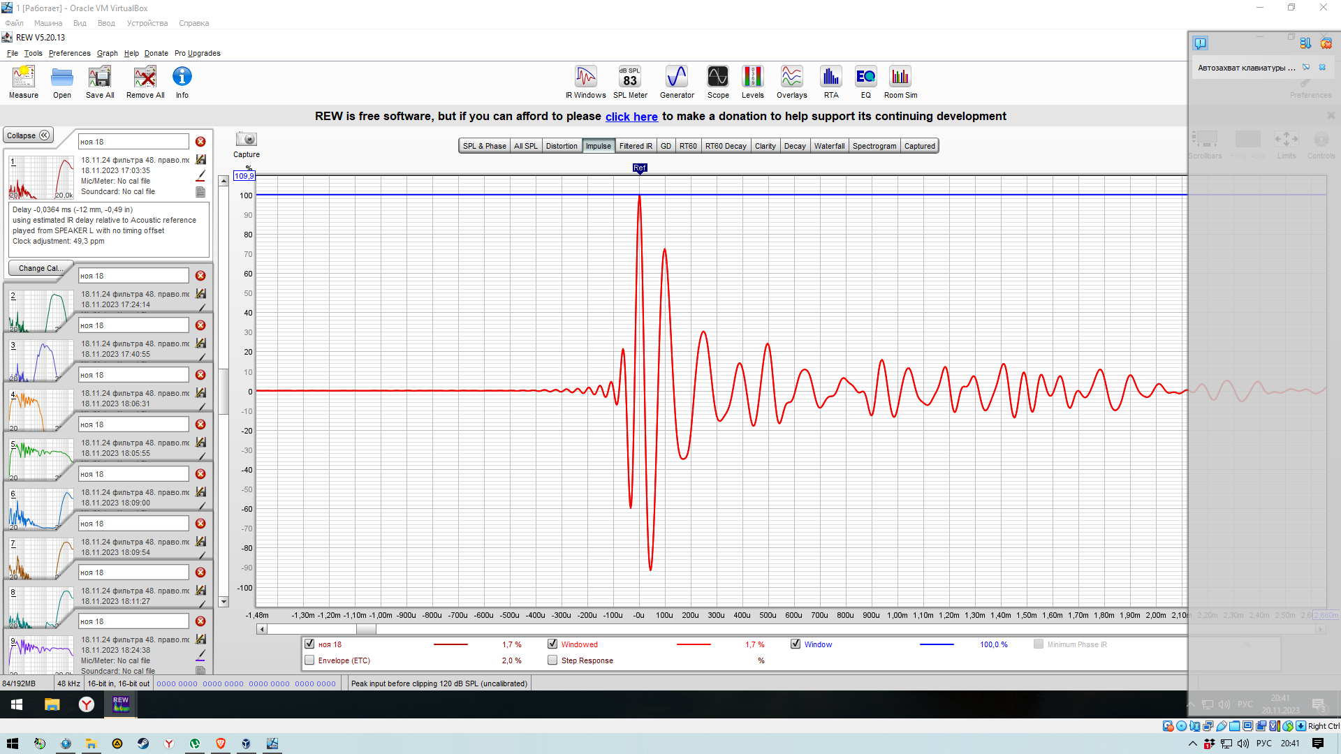 1. В VirtualBox я дома открываю REW, что бы проанализировать, снять скрины. На системе стоит видеокарта Vega 56. Из-за нее, скорее всего, не могу работать с REW. Нашел такой выход. (сама система в другом месте).