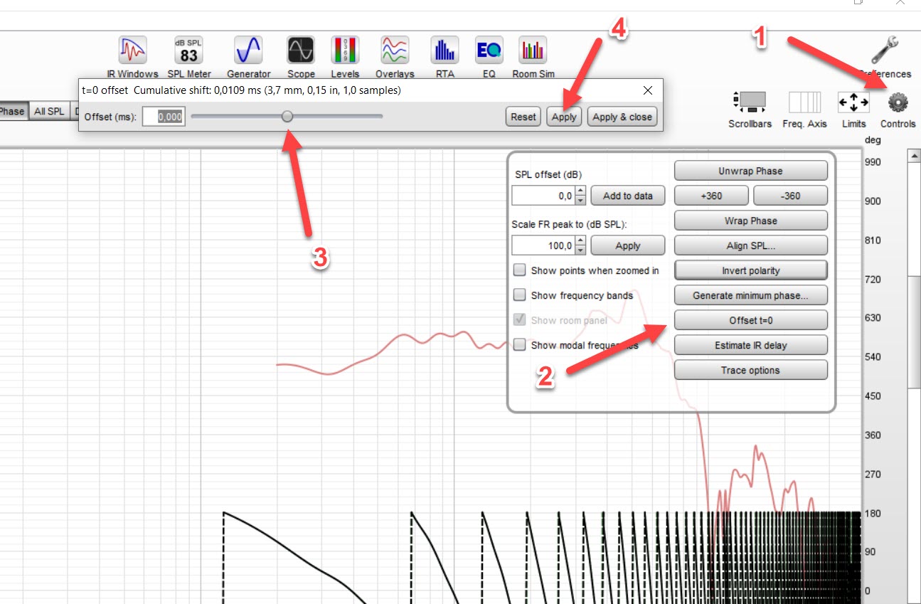 Тайм оффсет устанавливается равным для всех динамиков, а не как автоматом выставляет REW до упора в импульс.