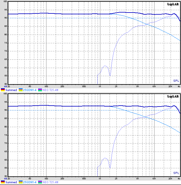 Кстати, вот симуляция стыковки "заводской" АЧХ Т25.4 с идеальным динамиком этим фильтром, а ниже - если добавить упомянутый режектор. В реальности у 25ГДН есть спад после 5к, поэтому выше 5к должно чуть-чуть проседать, в пределах 1.5 Дб, но всё равно очень красяво. А вот в районе 4.5к и левее всё по правде совсем-совсем не так, а как - я за неимением микрофона не знаю Т.е., явно надо поправить номиналы, чтобы вырезать ещё и собственный горб у 25ГДН.