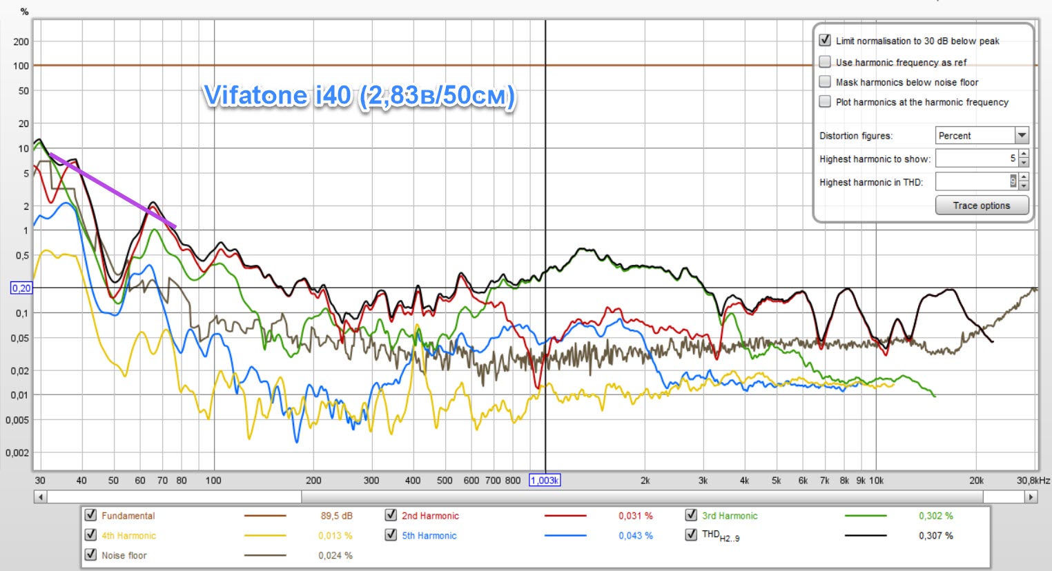 На провал в районе 52 гц не обращайте внимания - он на искажениях всегда при измерении любой АС у меня в комнате есть. Ориентируйтесь по сиреневой подрисованной линии. Там стояк комнаты, основной тон усиливается многократно, на этом фоне гармоники высчитываеются меньше на этом участке диапазона.