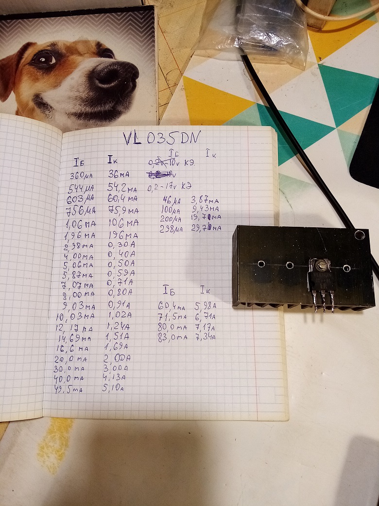 Я мерил на реальном транзисторе, выбрал с бетой ровно сотню. Но график чертить не стал, нечего чертить, прямая она и есть прямая, отклонение около 1-2%. Измерял китайскими тестерами DT-830, погрешность тестеров сомнительна да и пределы пришлось переключать, не факт, что на разных пределах погрешность одна. Вот фотка записи точек измерения беты на коленке, тапками прошу не кидать, измерял для себя, выкладывать не планировал. Транзистор выбрал с бетой ровно 100, измерения с двух ампер на пяти вольтах от компьютерного блока питания, в нагрузке проволочный резистор 0,1ом. До двух ампер от лабораторного блока питания, менял напряжение коллектор - эмиттер от 0,2-0,5 до 17 вольт, ток не меняется, нагрузка 10ом. Могу выслать транзисторы для самостоятельных измерений. ))