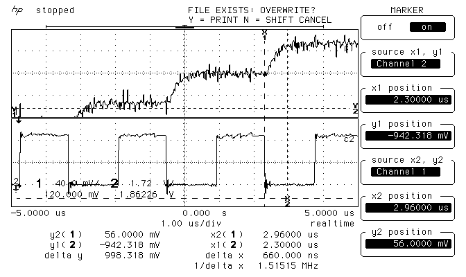 Первое изображение - увеличенный фронт сигнала с выхода восстанавливающего фильтра при воспроизведении меандра амплитудой +/-FS (полной шкалы) и частотой Fs/384. Fs заложена - 352800 Гц, то есть частота в данном случае - 918.75 Гц. Переходная характеристика очень схожа с той, что отображается при моделировании восстанавливающего фильтра (второе изображение).