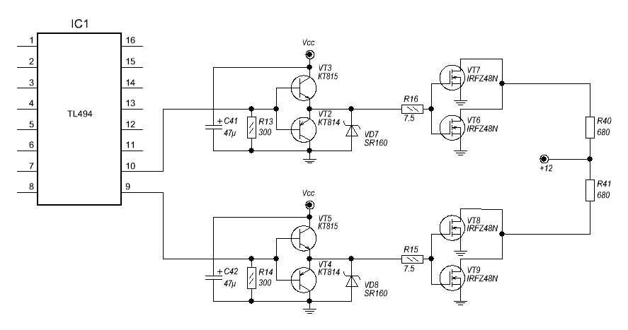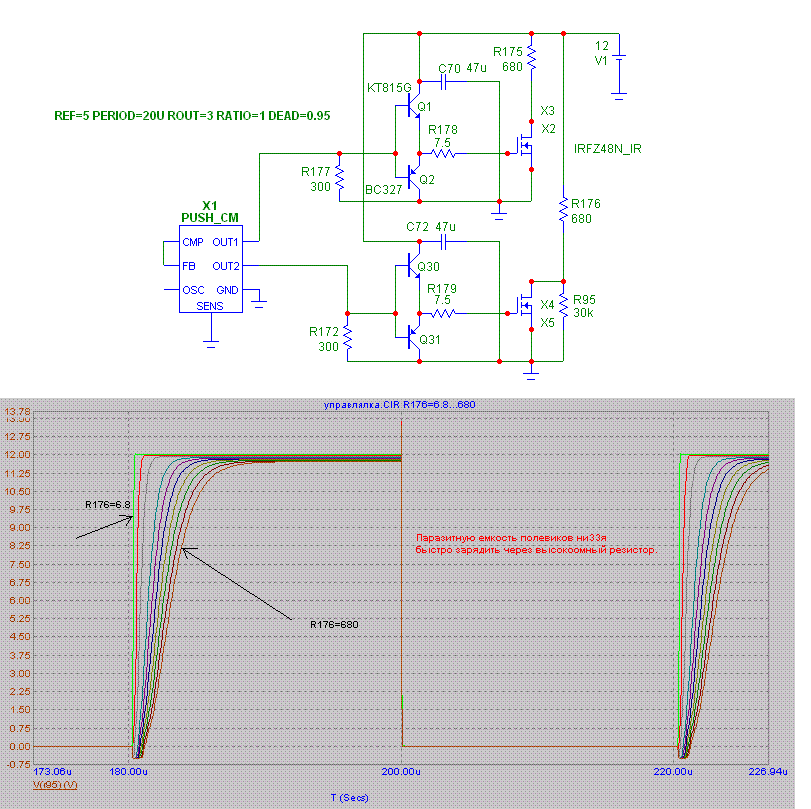 Кстати СКОРОСТЬ переключения фронтов затвора и соответсвенно вашего IRFZ48N БОЛЬШАЯ не нужна, почему? Да просто в связи с такой быстрой скоростью изменения dv/dt у вас будут выбпросы на СТОКЕ, а значит КПД упадет , помехи в радиоэфир и в усь вы пустите и драйверу ПЛОХО БУДЕТ, так что ТОЛКУ НЕТ от быстрой скорости.....