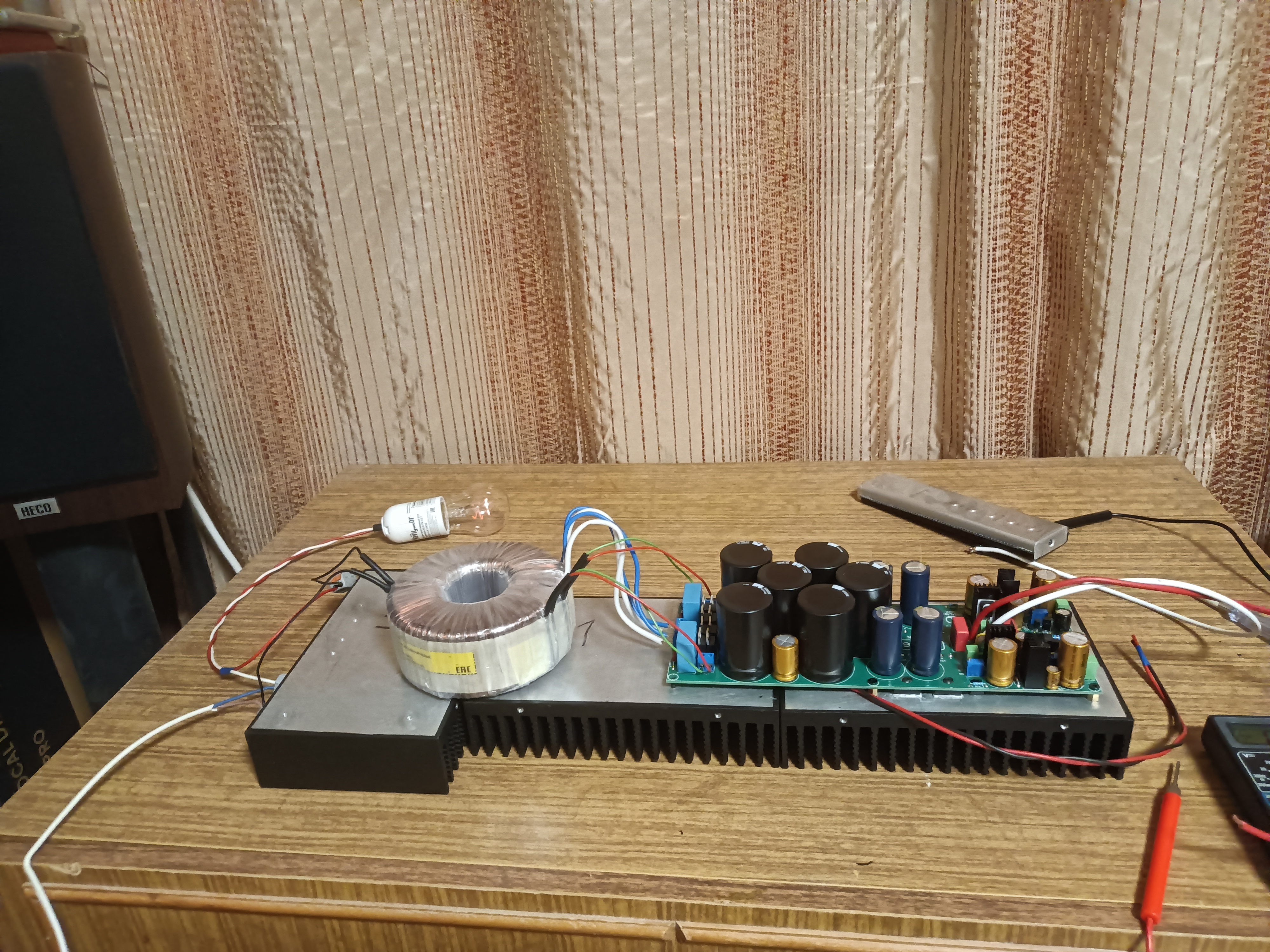 Вчера запаял выходные транзисторы и остатки электролитов на второй канал. Сегодня все прикрутил на радиатор и запустил для пробы (без замеров). Все хорошо.