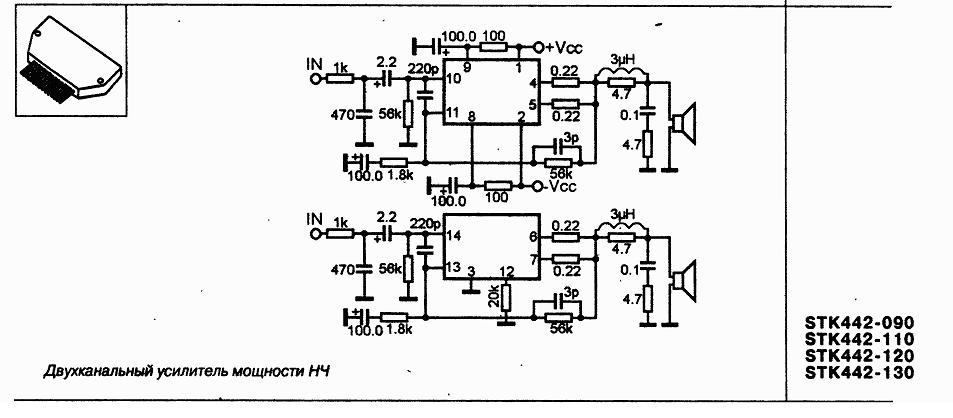 Black_Panther, что можите сказать о серии STK442-xxx в инете не нашел даташиты. Особенно интересует 442-130. Есть схема включения и ПП? Схему нашел кому интересно изображение ниже. Хотелось бы услышать мнение о том как она играет. STK442-130 VS STK4241II ? Купил на пробу... фото ниже что скажите оригинал?